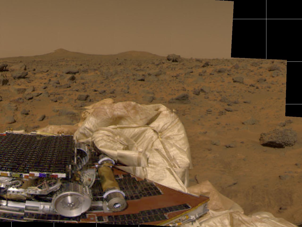 The Imager for Mars Pathfinder (IMP) took this image of surrounding terrain in the mid-morning on Mars (2:30 PM Pacific Daylight Time) earlier today. Part of the small rover, Sojourner, is visible on the left side of the picture. The tan cylinder to the right of the rover is one of two rolled-up ramps by which the rover will descend to the ground. The white, billowy material in the center of the picture is part of the airbag system. Many rocks of different shapes and sizes are visible between the lander and the horizon. Two hills are visible on the horizon. The notch on the left side of the leftmost conical hill is an artifact of the processing of this picture.