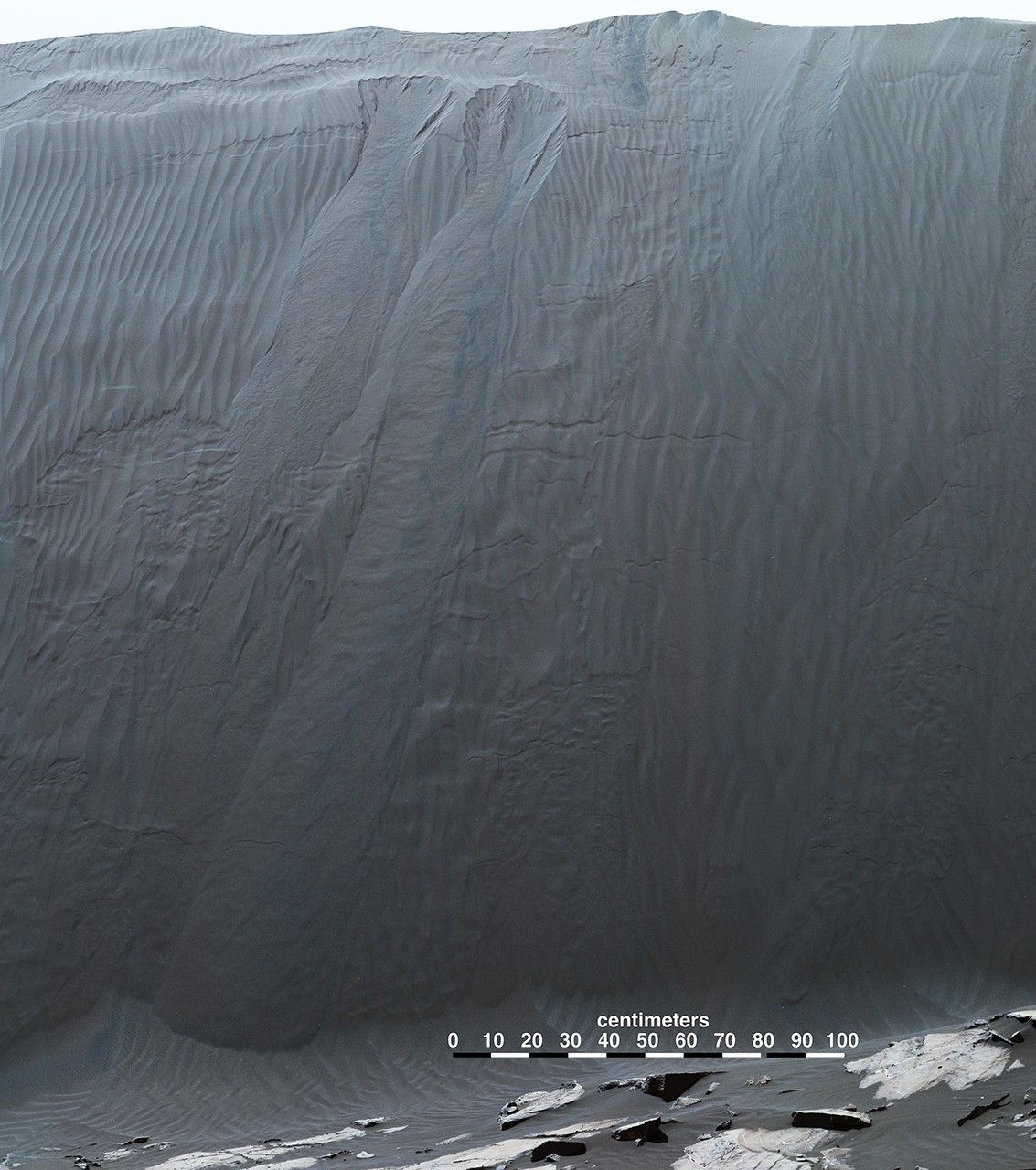 This view combines multiple images from the telephoto-lens camera of the Mast Camera (Mastcam) on NASA's Curiosity Mars rover to reveal fine details of the downwind face of "Namib Dune." The site is part of the dark-sand "Bagnold Dunes" field along the northwestern flank of Mount Sharp. Images taken from orbit have shown that dunes in the Bagnold field move as much as about 3 feet (1 meter) per Earth year.