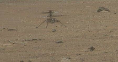 NASA's Ingenuity Mars Helicopter lands with a soft bounce after its fifth flight on May 7, 2021. The images in this GIF were captured by the Mastcam-Z imager aboard NASA's Perseverance rover.