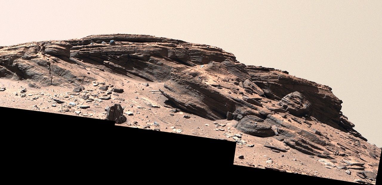 The mosaic is made up of three individual images that were stitched together after being sent back from Mars. This natural color view is approximately how the scene would appear to an average person if they were on Mars.