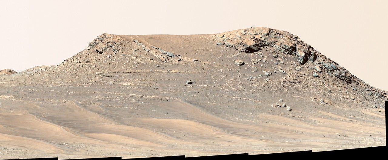 NASA's Perseverance Mars rover captured this mosaic of an isolated hill nicknamed "Pinestand." Scientists think sedimentary layers stacked on top of one another here could have been formed by a deep, fast-moving river. But uncertainty about their formation remains because the layers are exceptionally tall by Earth geology standards to have been created by a river – some standing 66 feet (20 meters) high.