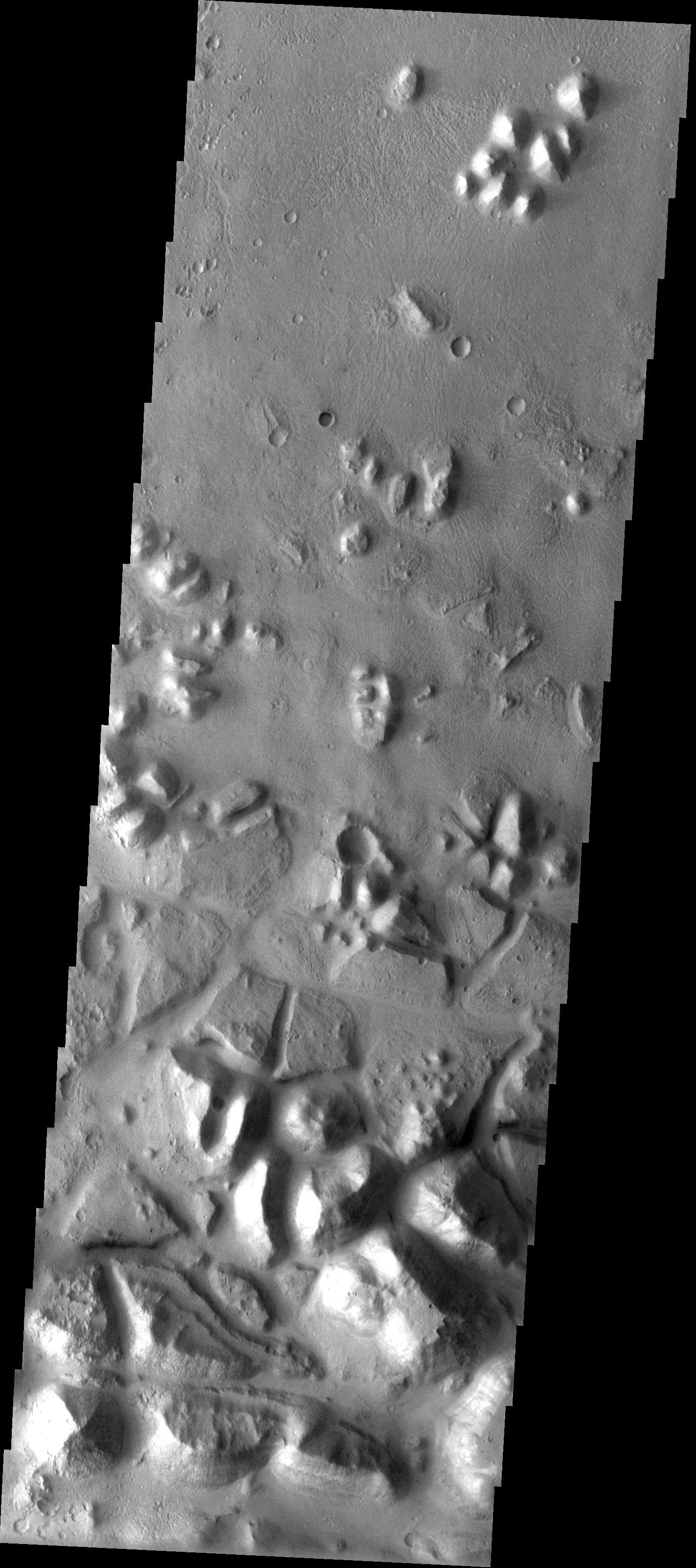 Note: this THEMIS visual image has not been radiometrically nor geometrically calibrated for this preliminary release. An empirical correction has been performed to remove instrumental effects. A linear shift has been applied in the cross-track and down-track direction to approximate spacecraft and planetary motion. Fully calibrated and geometrically projected images will be released through the Planetary Data System in accordance with Project policies at a later time.