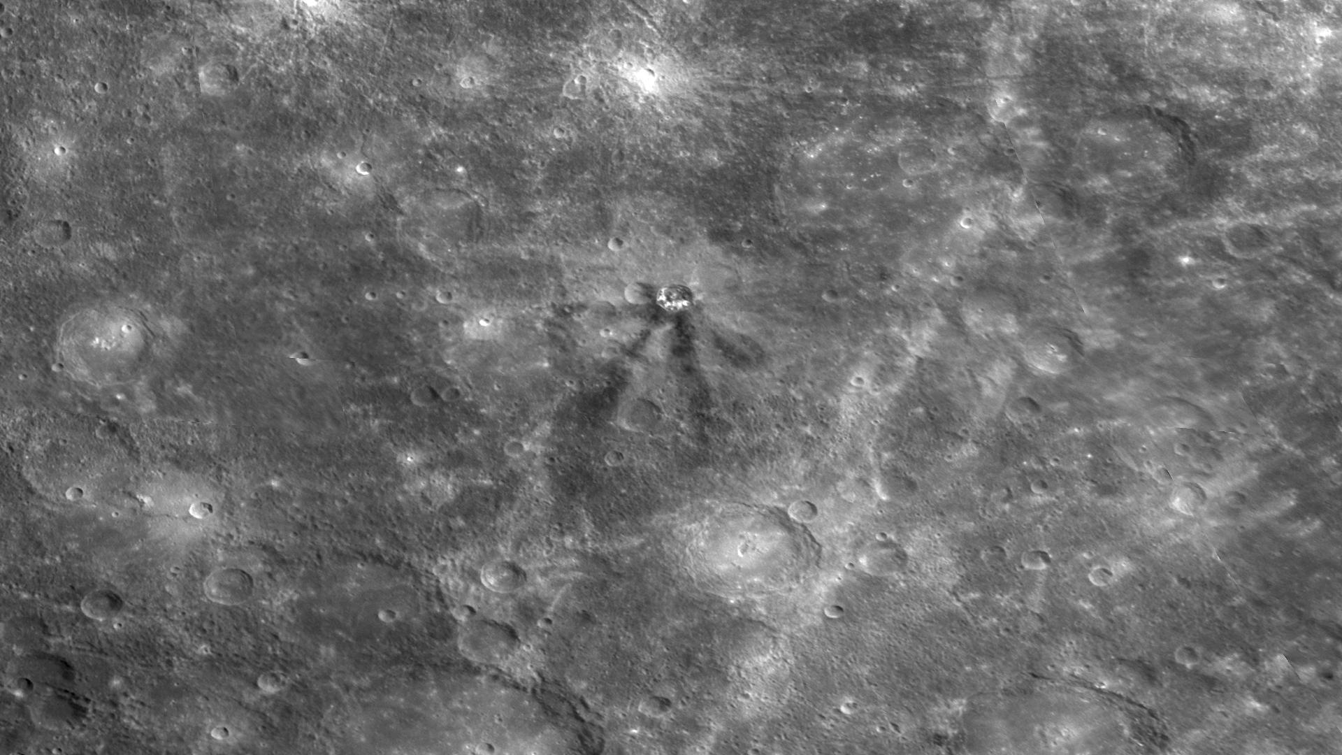 When a meteoroid strikes the surface of a planet, material from the target area is ejected outward at high velocity, often creating rays that extend over distances far greater than the size of the crater formed by the impact. During MESSENGER's second Mercury flyby, MDIS captured images of many impressive rays on Mercury, such as the ejecta prominent around Kuiper crater and the extensive ray system associated with the northerly Hokusai crater. For both of those examples, the rays appear bright, which is characteristic of freshly pulverized rock and indicates that the rays are younger than much of Mercury's surface. In contrast, in the center of this image, a set of dark rays can be seen emanating from the small crater Matabei. Dark rays are rare on Mercury, but other occurrences have been identified, such as at Mozart crater. Mozart is interpreted to have excavated dark material from depth during the impact event, creating dark streamers. The dark rays from Matabei may have a similar origin, and color images to be obtained during MESSENGER's orbital mission phase will be used to explore further the nature of these unusual dark rays.