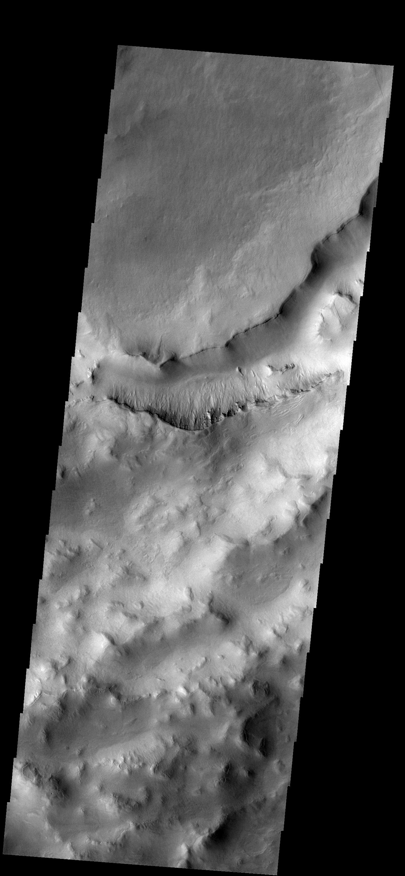 One of the most interesting features of Maunder Crater is the large trough seen in this image. The crater rim is in the bottom portion of the image and the floor is to the top of the image. The floor of Maunder Crater has been filled by a significant amount of material. At some time after the filling event, the large trough developed. How and why the trough came to be is unknown.