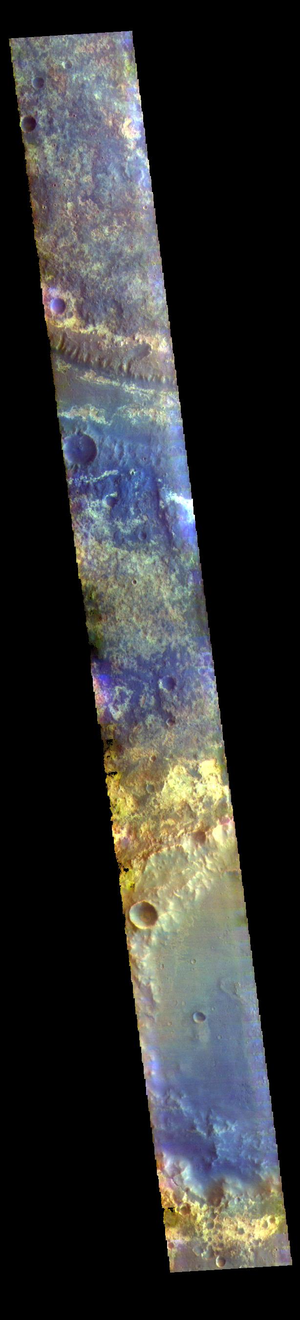 The THEMIS VIS camera contains 5 filters. The data from different filters can be combined in multiple ways to create a false color image. These false color images may reveal subtle variations of the surface not easily identified in a single band image. Today's false color image shows a small section of Mawrth Vallis (near the top of the image). Of all the channels carved by flowing water on Mars, one of the more unusual is Mawrth Vallis, whose name comes from the Welsh word for Mars. Mawrth winds through northwest Arabia Terra for some 640 kilometers (400 miles) before emptying into Acidalia Planitia on the edge of the vast northern lowlands. Unlike many outflow channels that start in regions of chaotic terrain, Mawrth Vallis just appears and then grows deeper as it heads downstream, holding a width of approximately 15 km (9 mi) until it widens near its mouth at Chryse Planitia.