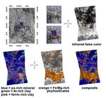 The lower left image reveals two discrete clay units as well as an overlying layer of the material rich in the volcanic mineral pyroxene. The bottom-center image reveals the location of ferromagnesian (iron- and magnesium-rich) phyllosilicates superimposed on a grayscale version of the infrared image. The lower right image is a composite that combines the two previous spectral images.
