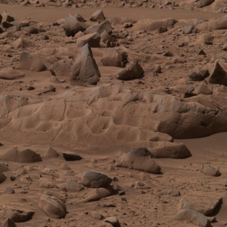 This approximate true-color image taken by the panoramic camera on the Mars Exploration Rover Spirit shows the rock dubbed "Mazatzal" before the rover drilled into it with its rock abrasion tool. On sol 82, Spirit ground into a circular patch of the rock called "New York," then repeated this operation on sol 85 to complete the hole. Several observations were made during this grinding process with the rover's suite of scientific instruments. Preliminary results suggest that fluid may have been present during Mazatzal's formation. Images from the panoramic camera's blue, green and red filters (480, 530 and 600-nanometer filters) were combined to make this picture.