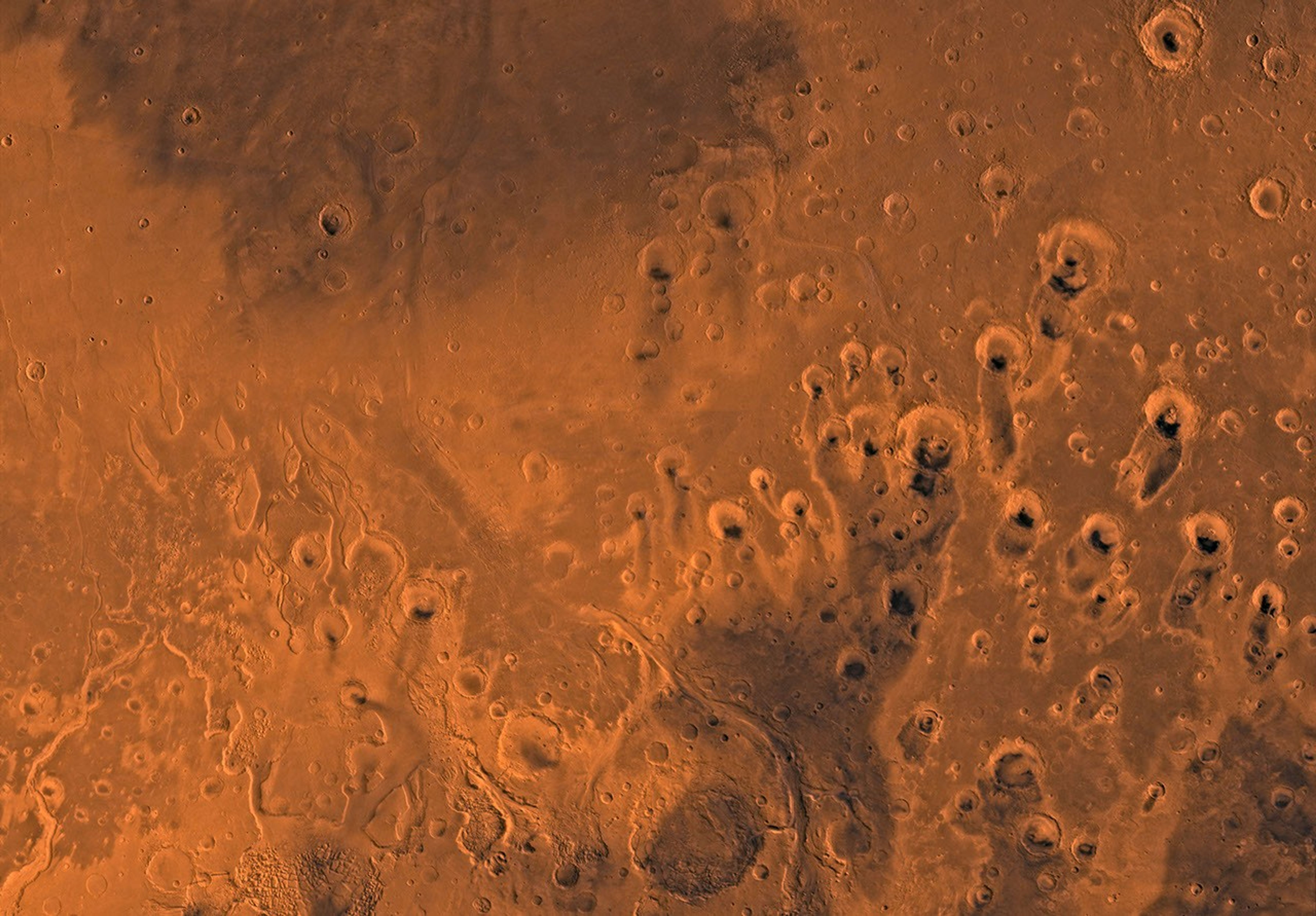 Mars digital-image mosaic merged with color of the MC-11 quadrangle, Oxia Palus region of Mars. Heavily cratered highlands of the southeastern two-thirds are cut by several large outflow channels. These channels terminate at the dark large depression, Chryse basin, which contain relatively smooth plains in the northwestern part. Latitude range 0 to 30 degrees, longitude range 0 to 45 degrees.