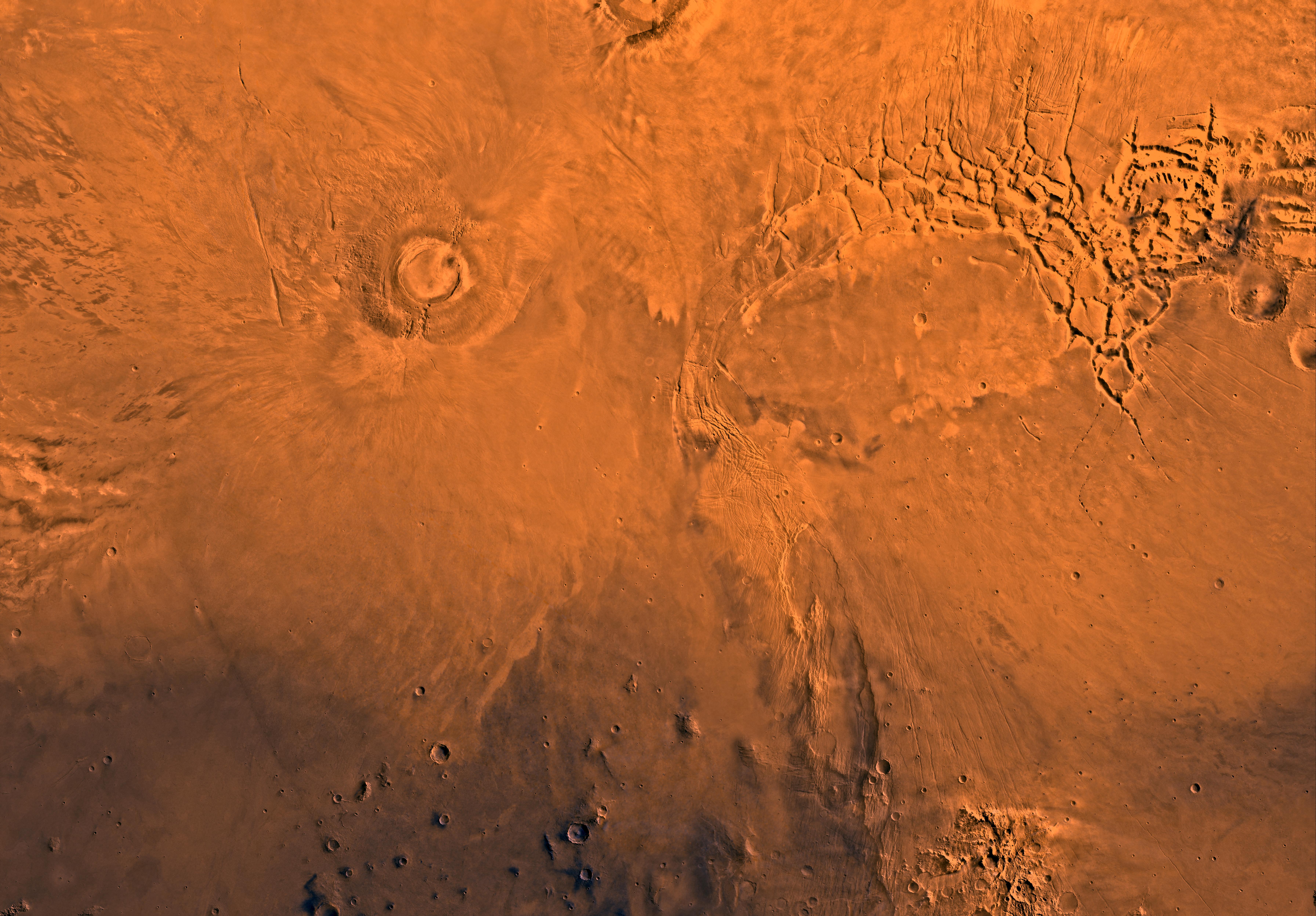 Mars digital-image mosaic merged with color of the MC-17 quadrangle, Phoenicis Lacus region of Mars. Two of the four largest shield volcanoes on Mars are within the northwestern part, the south half of Pavonis Mons and Arsia Mons. The eastern part includes Syria and Sinai Plana. Most of the quadrangle forms the Tharsis plateau--the highest plateau on Mars; its elevation, 10 km, is twice that of the Tibetan Plateau, the highest plateau on Earth. Also in the northeastern part is Noctis Labyrinthus, a complex system of fault valleys at the west end of Valles Marineris. The south-central part is marked by the large fault system, Claritas Fossae. Latitude range -30 to 0 degrees, longitude range 90 to 135 degrees.