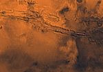 Mars digital-image mosaic merged with color of the MC-18 quadrangle, Coprates region of Mars. Moderately cratered and faulted highland ridged plains in the northern and southern parts are cut by the prominent Valles Marineris chasma system, which reaches depths of 10 km and extends in an east-southeast direction for about 2,500 km across the quadrangle. The long, central canyons appear to be large, fault-bounded rifts, whereas some of the isolated, northern canyons are the sources of large outflow channels. Latitude range -30 to 0 degrees, longitude range 45 to 90 degrees.