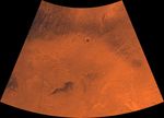 Mars digital-image mosaic merged with color of the MC-2 quadrangle, Diacria region of Mars. The northern two-thirds is dominated by relatively smooth plains. The southeastern part is marked by aureole deposits of the largest known volcano in the solar system, Olympus Mons. Latitude range 30 to 65 degrees, longitude range 120 to 180.