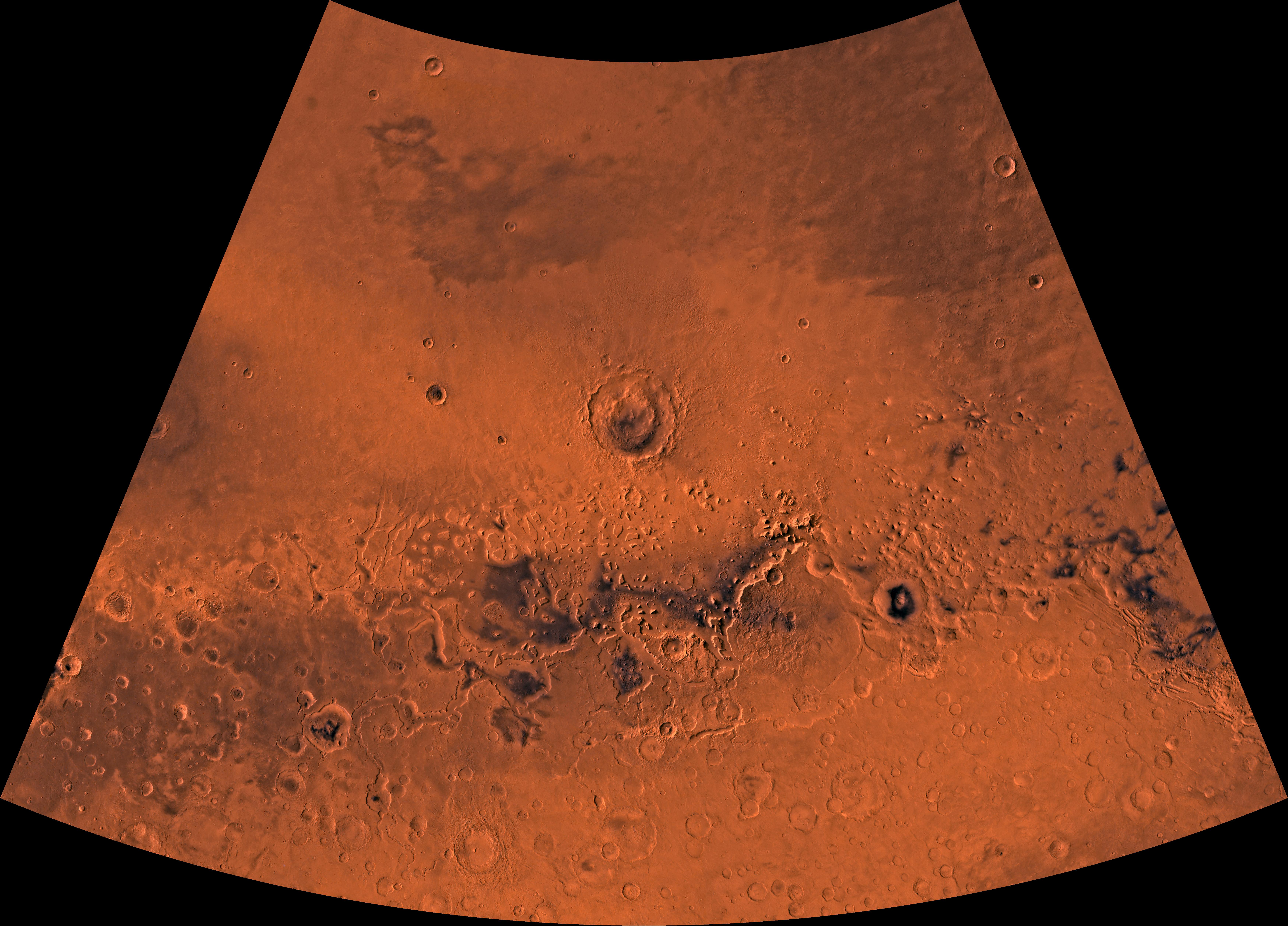 Mars digital-image mosaic merged with color of the MC-5 quadrangle, Ismenius Lacus region of Mars. Heavily cratered highlands of the southern part are separated from the relatively smooth plains of the northern part by a belt of dissected terrain, containing mesas and buttes. Latitude range 30 to 65 degrees, longitude range -60 to 0 degrees.