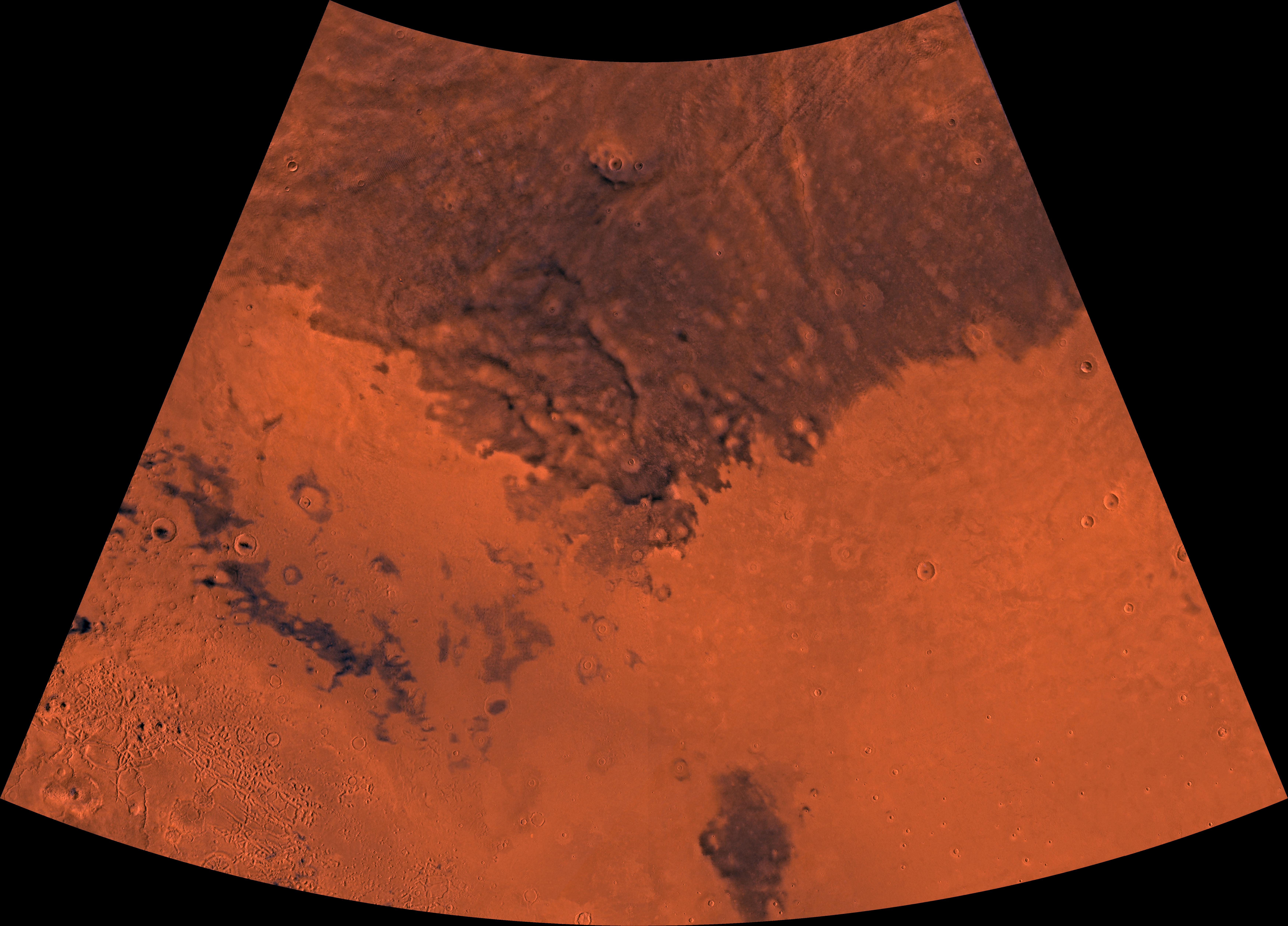 Mars digital-image mosaic merged with color of the MC-6 quadrangle, Casius region of Mars. Except for the highly dissected southwestern part, which contains faults, mesas, and buttes of Nilosyrtis Mensae, the Casius region is dominated by light-colored and dark, relatively smooth plains. Latitude range 30 to 65 degrees, longitude range -120 to -60 degrees.