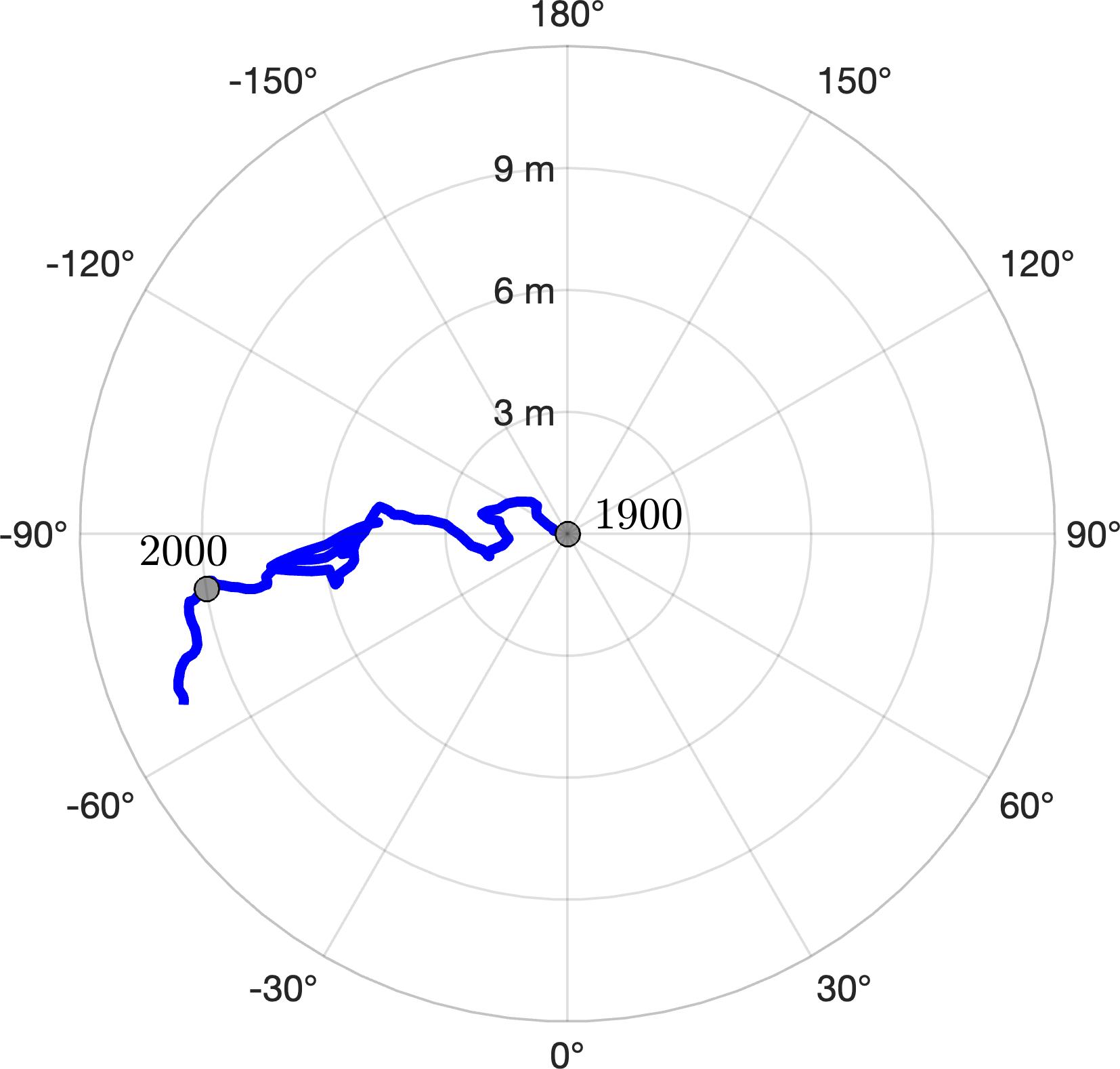 The blue line starts at the position of the spin axis near the North Pole in 1900, the first year polar motion data was collected, and tracks it until 2023. The spin axis now sits about 30 feet (10 meters) from where it was in 1900, in the direction of Canada's Baffin Bay. Around 2000, the axis took a sudden eastward turn, which researchers at NASA's Jet Propulsion Laboratory in Southern California in a 2016 study attributed to faster melting of the Greenland and Antarctic ice sheets and groundwater depletion in Eurasia.