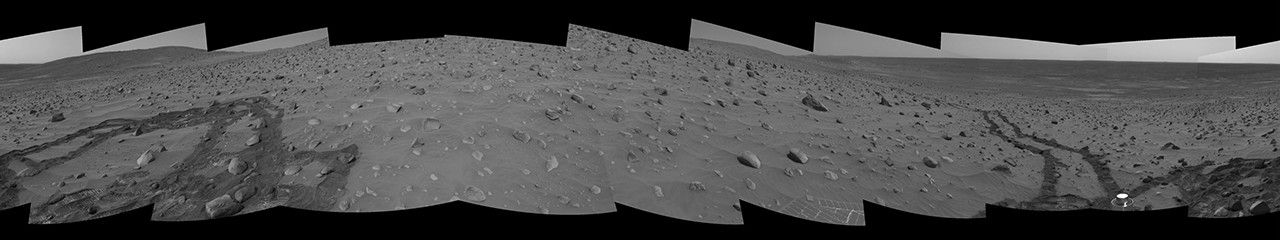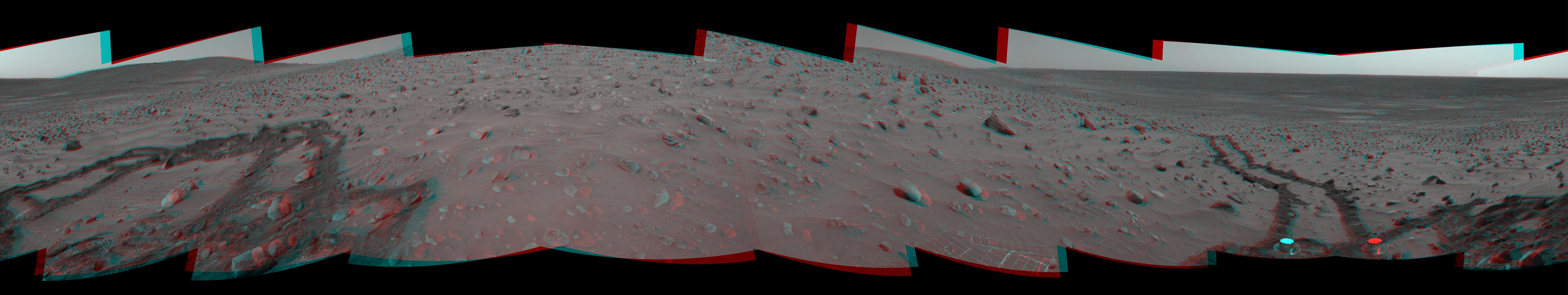 This 360-degree, stereo panorama of a section of the "Columbia Hills" shows meandering, crisscrossing wheel tracks that NASA's Mars Exploration Rover Spirit left behind while using its scientific instruments to analyze a new class of rocks in Gusev Crater on Mars. Because Spirit has been experiencing a high rate of slip on the sandy, sloped terrain on this flank of "Husband Hill," scientists are directing the rover to check its progress often to avoid getting a rock stuck in one of its wheel wells.
