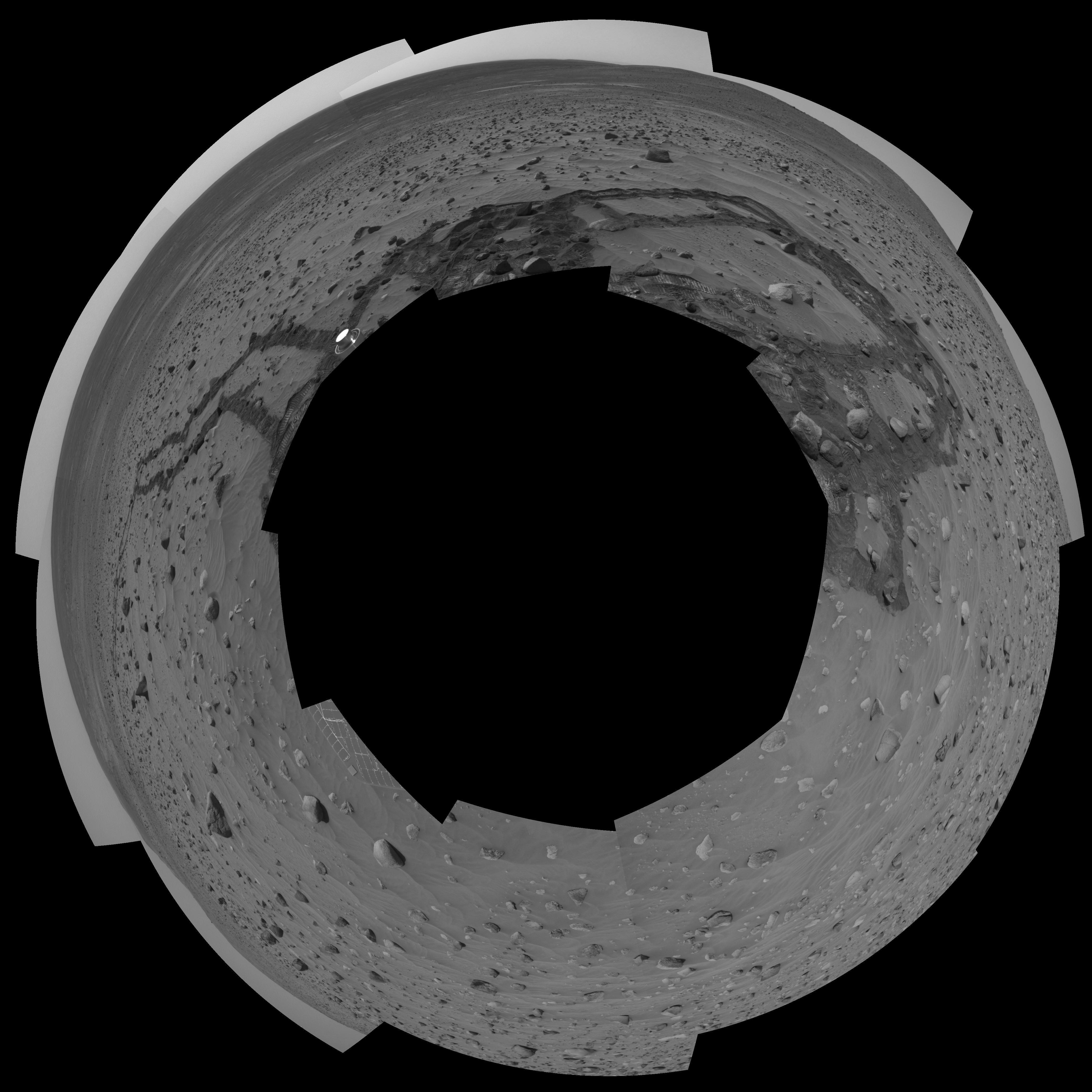This view is a mosaic of frames that Spirit took with its navigation camera during the rover's 358th and 359th martian days, or sols, (Jan. 3 and 4, 2005). It is presented here in a polar projection with geometric seam correction.