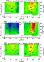 Observations (from the Thermal Emission Spectrometer, or TES, instrument) covering one half martian year allow us to follow the development of the northern winter polar vortex. This high speed west wind builds up from fall ("early October" in a calendar seasonally equivalent to the terrestrial calendar) to maximum strength in winter ("late December"). As spring approaches ("late March"), it gradually declines. At maximum strength its winds exceed 160 m/s (360 miles per hour). It also acts as an effective barrier to the northward transport of atmospheric dust; during its most active phase, only condensates (water and CO2 ices) were observed in its core. Detailed study of this effect is important to determine the accumulation of deposits on the permanent polar cap.