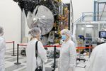 A member of the media interviews the principal investigator of NASA's Psyche mission, Lindy Elkins-Tanton, in front of the spacecraft on April 11, 2022, inside a clean room at NASA's Jet Propulsion Laboratory in Southern California. After engineers at JPL put their final touches on the spacecraft, Psyche will ship to NASA's Kennedy Space Center in Florida, where it is scheduled to launch in August 2022 on a journey to a metal-rich asteroid of the same name.