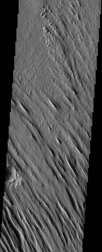 Note: this THEMIS visual image has not been radiometrically nor geometrically calibrated for this preliminary release. An empirical correction has been performed to remove instrumental effects. A linear shift has been applied in the cross-track and down-track direction to approximate spacecraft and planetary motion. Fully calibrated and geometrically projected images will be released through the Planetary Data System in accordance with Project policies at a later time.