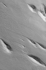 Erosive winds have removed large volumes of material in this Mars Global Surveyor (MGS) Mars Orbiter Camera (MOC) image to form yardang ridges. The most classic yardang shape is that of the inverted boat hull; each of these streamlined hills provides a near-textbook example. The landforms are found in the Medusae Sulci region near 5.7°S, 159.8°W. The image covers an area about 3 km (1.9 mi) wide, and is illuminated by sunlight from the lower left.