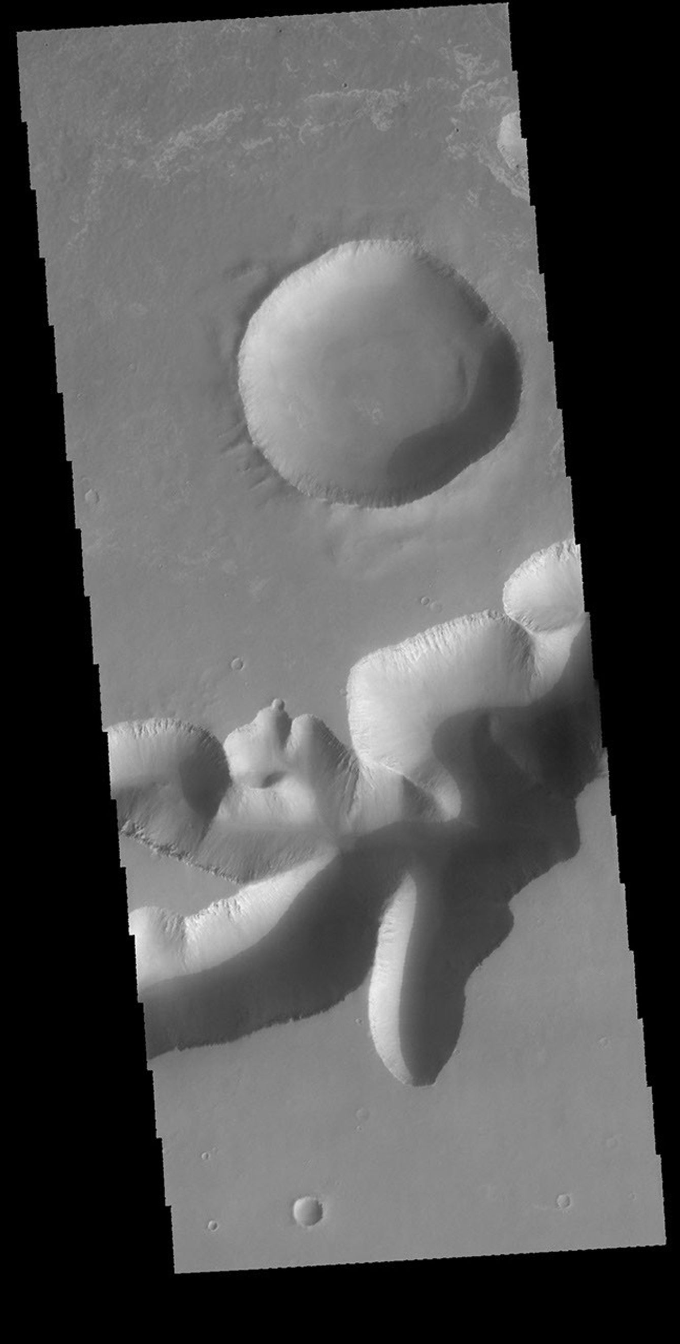 Today's VIS image shows one of the mega sized gullies located on the plains just south of Ius Chasma. This gully empties from Sinai Planum into the chasma.