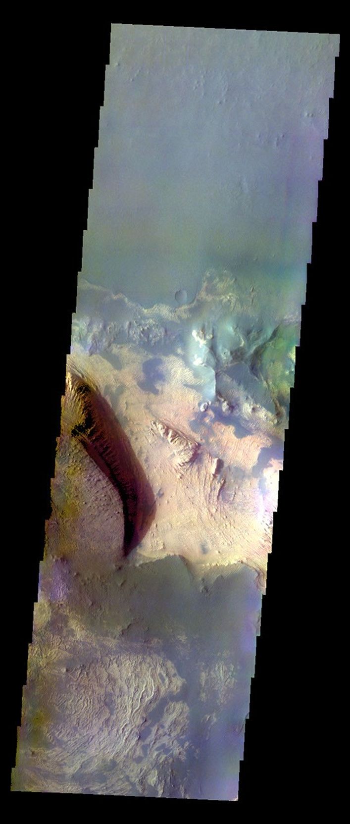 The THEMIS VIS camera contains 5 filters. The data from different filters can be combined in multiple ways to create a false color image. These false color images may reveal subtle variations of the surface not easily identified in a single band image. Today's false color image shows part of Melas Chasma.