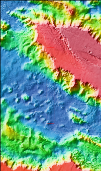 This false color image is located within Melas Chasma. The lobate forms at the bottom of the image are the remnants of landslides that crashed from the top of the cliff sides to the bottom of the chasma, a distance of 9km (5.5 miles). This distance is equivalent to the height of Mount Everest - the tallest land based mountain in the world.