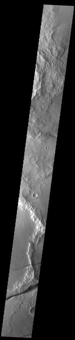 Fossae are long linear depressions called graben and are formed by extension of the crust and faulting. When large amounts of pressure or tension are applied to rocks on timescales that are fast enough that the rock cannot respond by deforming, the rock breaks along faults. In the case of a graben, two parallel faults are formed by extension of the crust and the rock in between the faults drops downward into the space created by the extension. The graben in this VIS image are part of Memnonia Fossae. Memnonia Fossae, Mangala Fossae and Sirenum Fossae are all long graben systems that stretch from eastern Terra Sirenum into western Daedalia Planum.