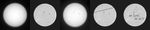 Each of the five versions of the image presented here blinks back and forth between two views recorded at different times during the transit. North is up. The version on the left is minimally enhanced, for a natural looking image of the sun with two sunspots barely visible. The second version has limb darkening removed, the edges masked. The third has enhanced contrast. The fourth has a line added to indicate the calculated path of Mercury during the transit. The fifth adds annotation to point out which spot is Mercury (in the cross hairs) and to identify two sunspots.