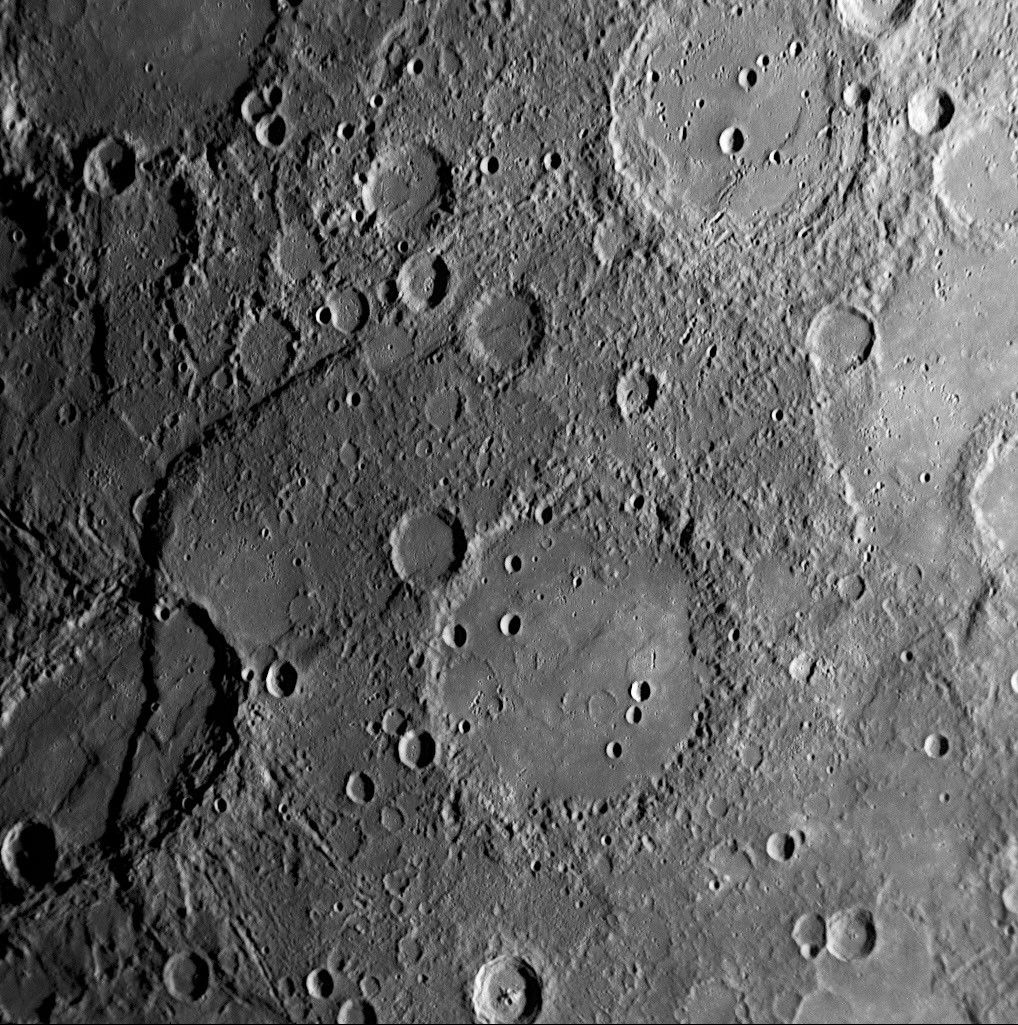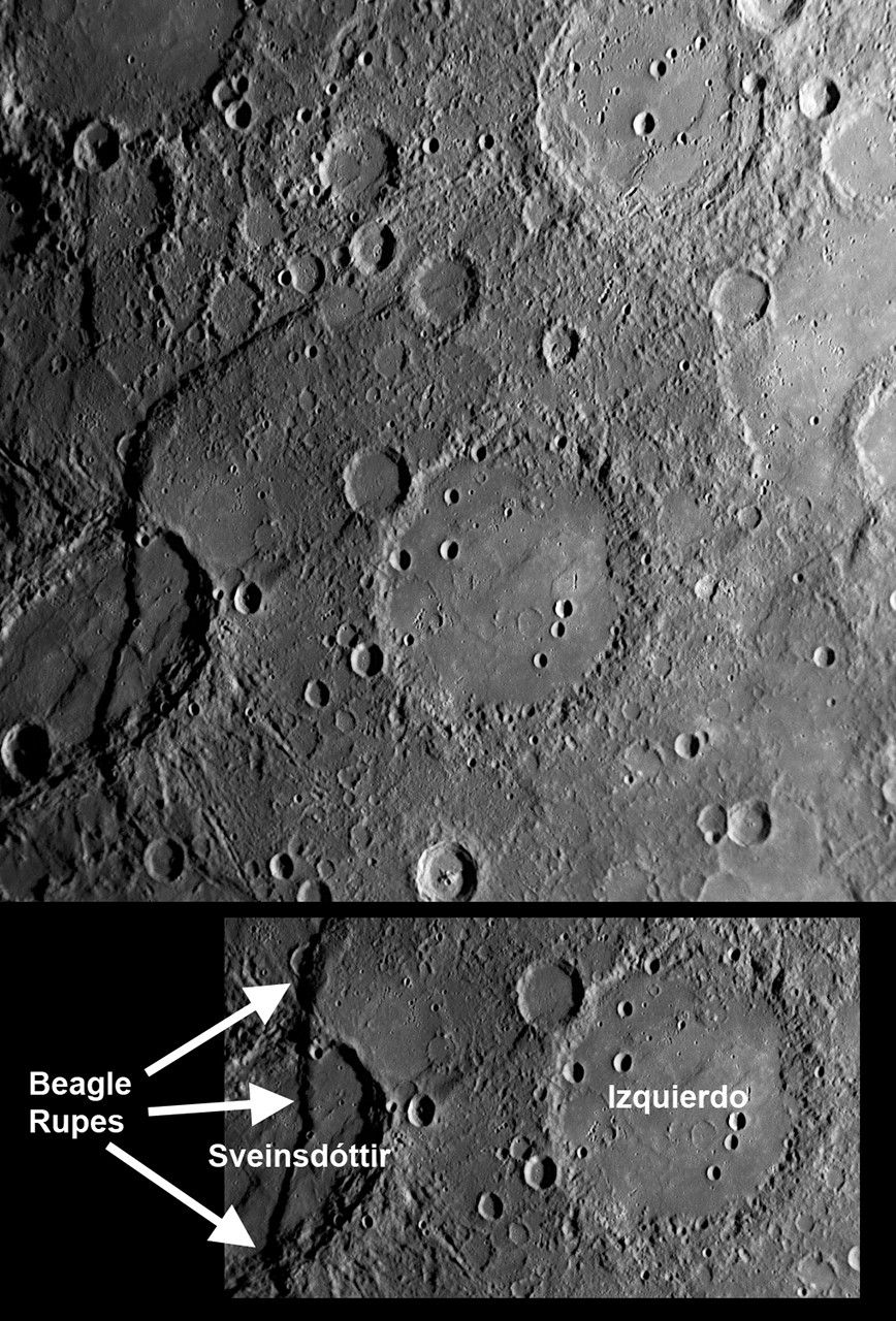 Located to the east of Beagle Rupes and Sveinsdóttir crater, a modest-sized impact basin on Mercury now bears the name of Izquierdo. It was named in July 2009 in honor of the 20th-century Mexican painter María Izquierdo. As seen in this NAC image, the floor of Izquierdo is smooth, the result of having been partially filled with volcanic lava. Circular outlines of the rims of "ghost craters" – smaller, older craters that have been largely buried by the lavas that infilled the basin – are visible in a few places on Izquierdo’s floor. The remnants of a buried inner ring are also barely discernible in spots, reminiscent of the image of Munkácsy released last week. There have been more recent impacts into the floor of Izquierdo, resulting in some small, sharply defined crater.