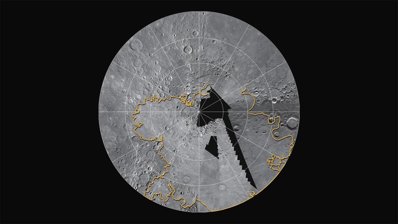 MESSENGER is currently filling in coverage of Mercury's north polar region, which was seen only partially during the Mariner 10 and MESSENGER flybys. Flyby images indicated that smooth plains were likely important in Mercury's northernmost regions. MESSENGER's orbital images show that the plains are among the largest expanses of volcanic deposits on Mercury, with thicknesses of several kilometers in many places. The estimated extent of these plains is outlined in yellow. This mosaic is a combination of flyby and orbital coverage in a polar stereographic projection showing latitudes from 50° to 90° N. The longitude at the 6 o'clock position is 0°.