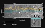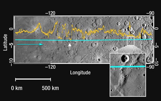 This figure shows about a 1,600 kilometer-long (1,000 mile-long) section of the MLA profile from MESSENGER’s second Mercury flyby superimposed on a portion of the NAC approach mosaic from the mission’s first Mercury encounter (see PIA10605). The blue line indicates the spacecraft ground track, and the yellow dots show the altimetry data points; the blue arrow shows the spacecraft’s direction of travel. This hemisphere has about 70% of the range in topography sampled by MLA during the first Mercury flyby (see PIA10394) and so this part of the equatorial hemisphere is smoother than that sampled last January. Near longitude -97° (263°E) there is a wrinkle ridge nearly 1 kilometer high (yellow arrow and white box containing a magnified view) that indicates horizontal shortening of the crust, possibly the result of global contraction associated with the cooling of the interior. In the longitude range of -115° to -120° (245°E to 240°E), the instrument sampled several craters of different depths with tilted floors (tilts of -0.5° to -0.2°; example indicated with a white arrow) that may have been the result of deformational processes.