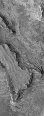 This Mars Global Surveyor (MGS) Mars Orbiter Camera (MOC) image shows layered, sedimentary rock exposures in the Sinus Meridiani region.