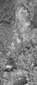 This Mars Global Surveyor (MGS) Mars Orbiter Camera (MOC) image shows eroded sedimentary rock outcrops in northern Sinus Meridiani.