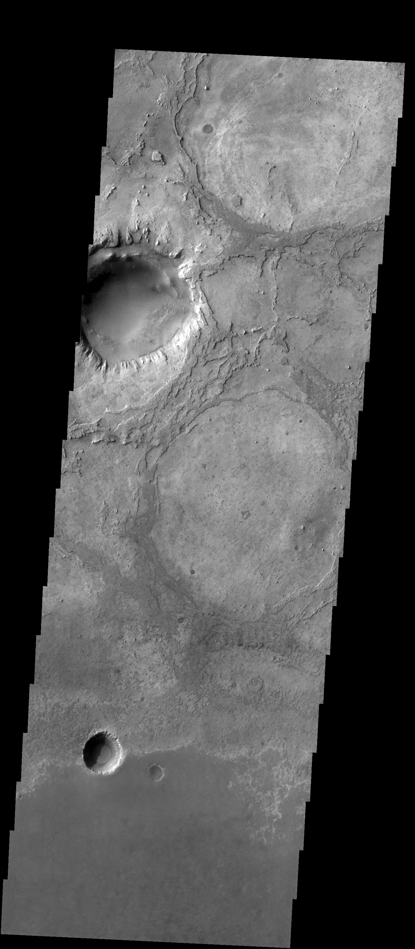 Note: this THEMIS visual image has not been radiometrically nor geometrically calibrated for this preliminary release. An empirical correction has been performed to remove instrumental effects. A linear shift has been applied in the cross-track and down-track direction to approximate spacecraft and planetary motion. Fully calibrated and geometrically projected images will be released through the Planetary Data System in accordance with Project policies at a later time.