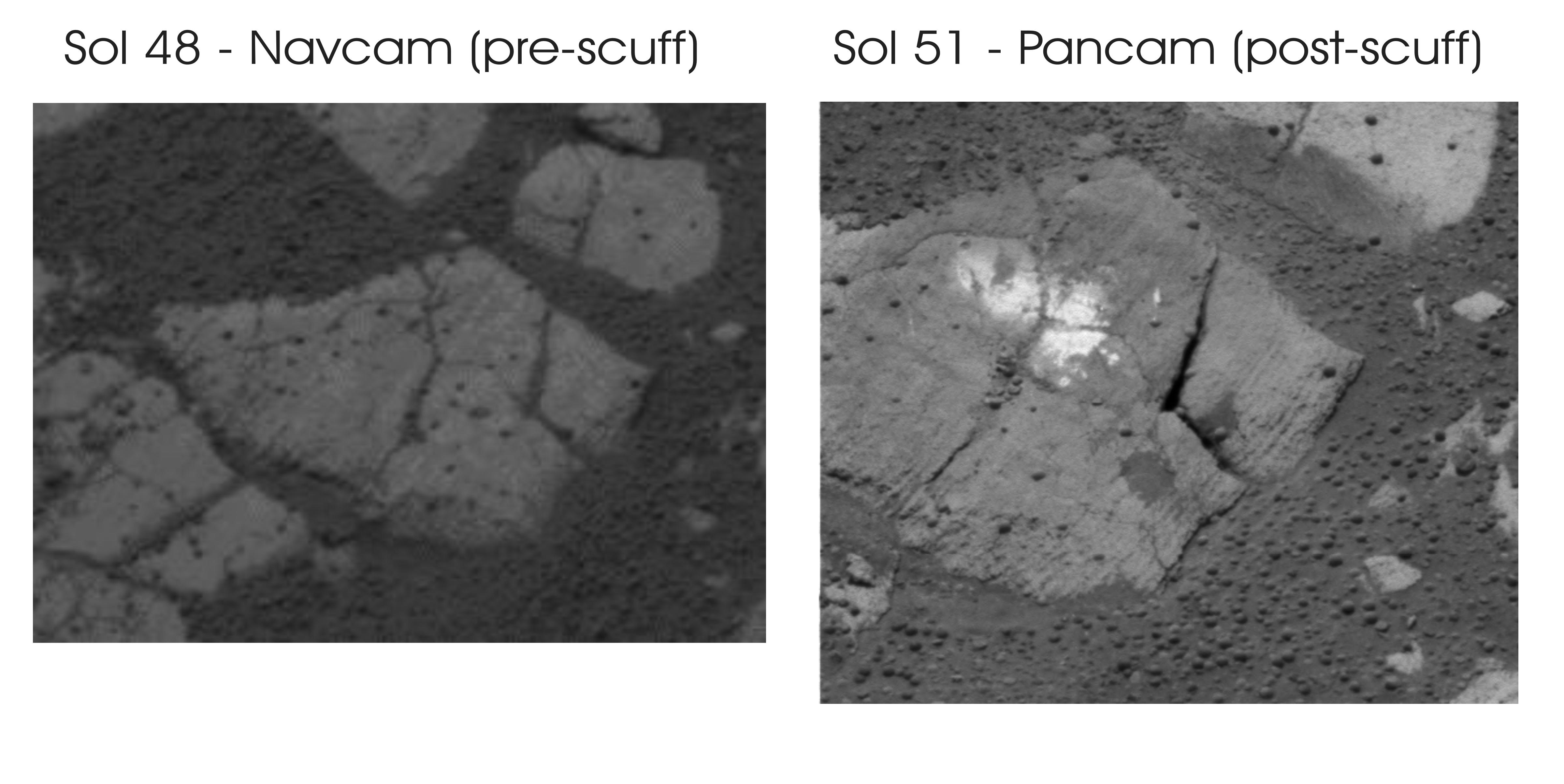 Dubbed "Carousel," the rock in this image was the target of the Mars Exploration Rover Opportunity science team's outcrop "scuff test." The image on the left, taken by the rover's navigation camera on sol 48 of the mission (March 12, 2004), shows the rock pre-scuff. On sol 51 (March 15, 2004), Opportunity slowly rotated its left front wheel on the rock, abrading it in the same way that geology students use a scratch test to determine the hardness of minerals. The image on the right, taken by the rover's navigation camera on sol 51, shows the rock post-scuff. In this image, it is apparent that Opportunity scratched the surface of "Carousel" and deposited dirt that it was carrying in its wheel rims.