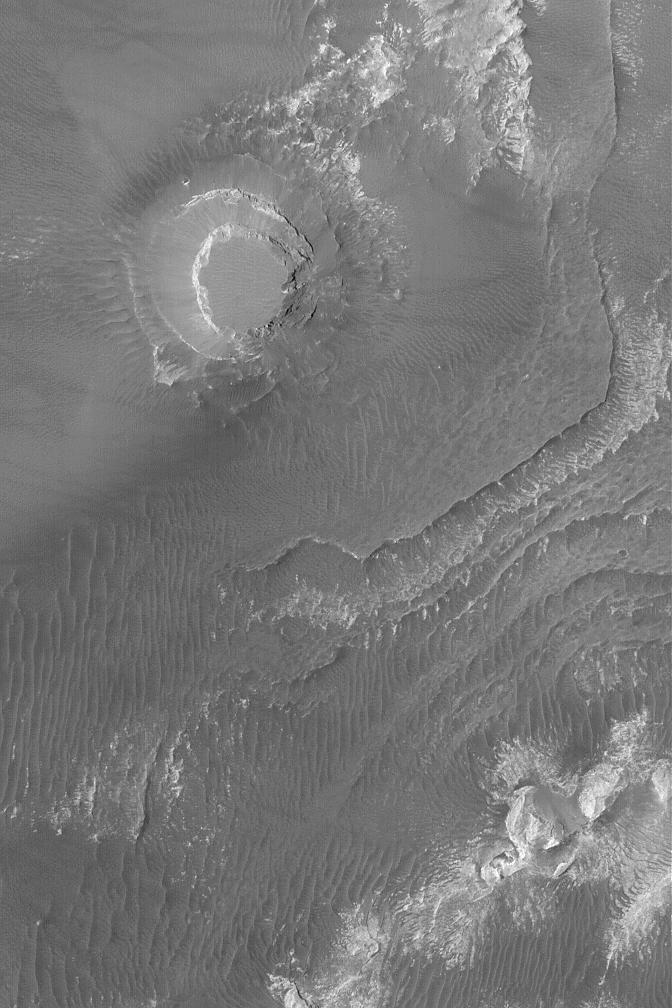 This Mars Global Surveyor (MGS) Mars Orbiter Camera (MOC) image shows a circular mesa and layered materials that are partially-exposed from beneath a thick, dark mantle in the Aureum Chaos region of Mars. The features are part of a much larger circular form (bigger than the image shown here) that marks the location of a crater that was filled with light-toned sedimentary rock, buried, and then later re-exposed when the upper crust of Mars broke apart in this region to form buttes and mesas of "chaotic terrain." The circular mesa in this image might also be the location of a formerly filled and buried crater. This image is located near 4.0°S, 26.9°W. It covers an area about 3 km (1.9 mi) across; sunlight illuminates the scene from the left/upper left.