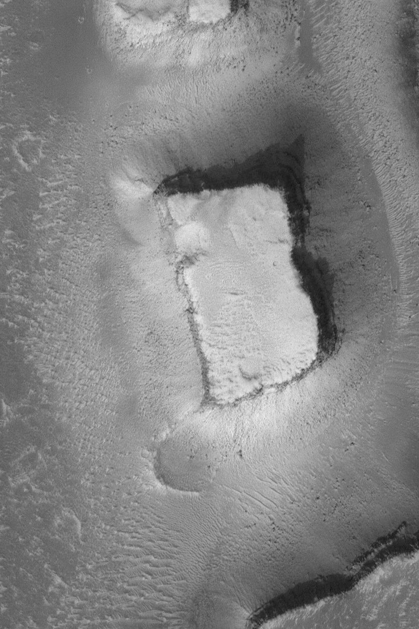 This Mars Global Surveyor (MGS) Mars Orbiter Camera (MOC) image shows a mesa left standing when erosion created the Granicus Valles system, located west of the Elysium volcanoes near 27.8°N, 224.3°W. Dark dots at the base of the mesa's slopes and on the valley floor are large boulders. The image covers an area about 3 km (1.9 mi) across. Sunlight illuminates the scene from the lower left.