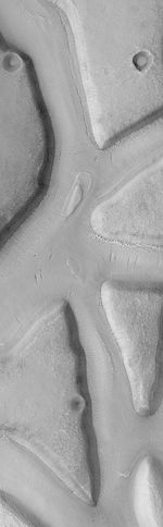 This Mars Global Surveyor (MGS) Mars Orbiter Camera (MOC) image shows a region of flat-topped mesas separated by valleys or troughs of similar depth and width. The valley floors have been covered by a material that has subsequently developed thin cracks and collapse pits aligned along some of these cracks. A few outcrops of layered material occur in the valleys as well. The valleys probably originally formed by faulting; the origin of the mantling material is unknown. The image covers an area approximately 2.3 km (1.4 miles) wide and was acquired in May 2001. Sunlight illuminates the scene from the lower left.