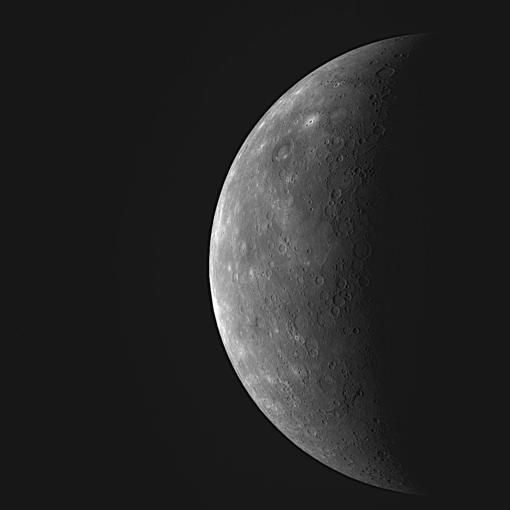 Yesterday, as the spacecraft approached Mercury for the mission's third flyby of the Solar System's innermost planet, MESSENGER captured thi striking view. This WAC image shows portions of Mercury's surface that had remained unseen by spacecraft even after the three flybys by Mariner 10 in 1974-75 and MESSENGER's two earlier flybys in 2008. In this image, just returned to Earth early this morning, the newly imaged terrain is located in a wide vertical strip near the limb of the planet (on the left side of Mercury's partially sunlit disk). Viewing the image coverage map from before the flyby provides more information on the location of the newly seen area. This WAC image is just one of 11 taken through the camera's narrow-band color filters, and this set of images will be used to examine color differences on Mercury's surface and to learn about the evolution of crustal rocks on the planet.
