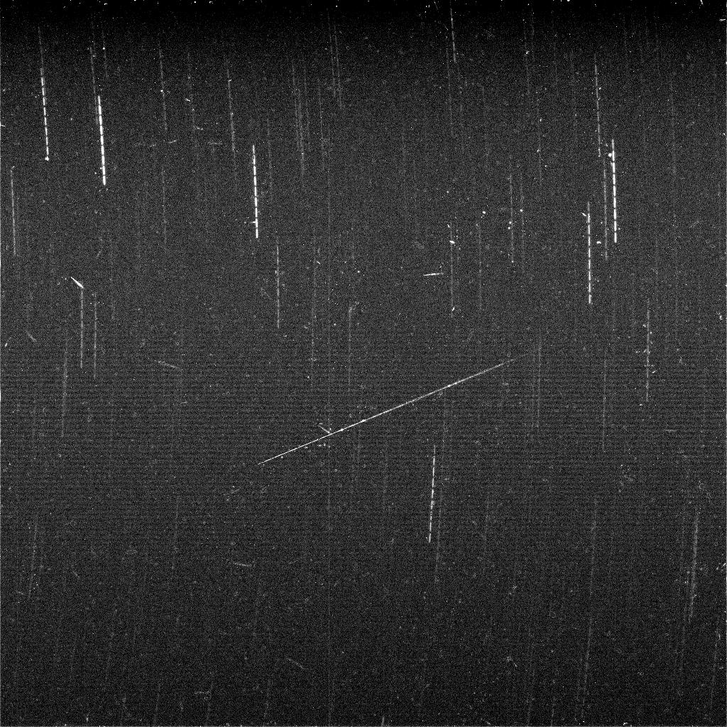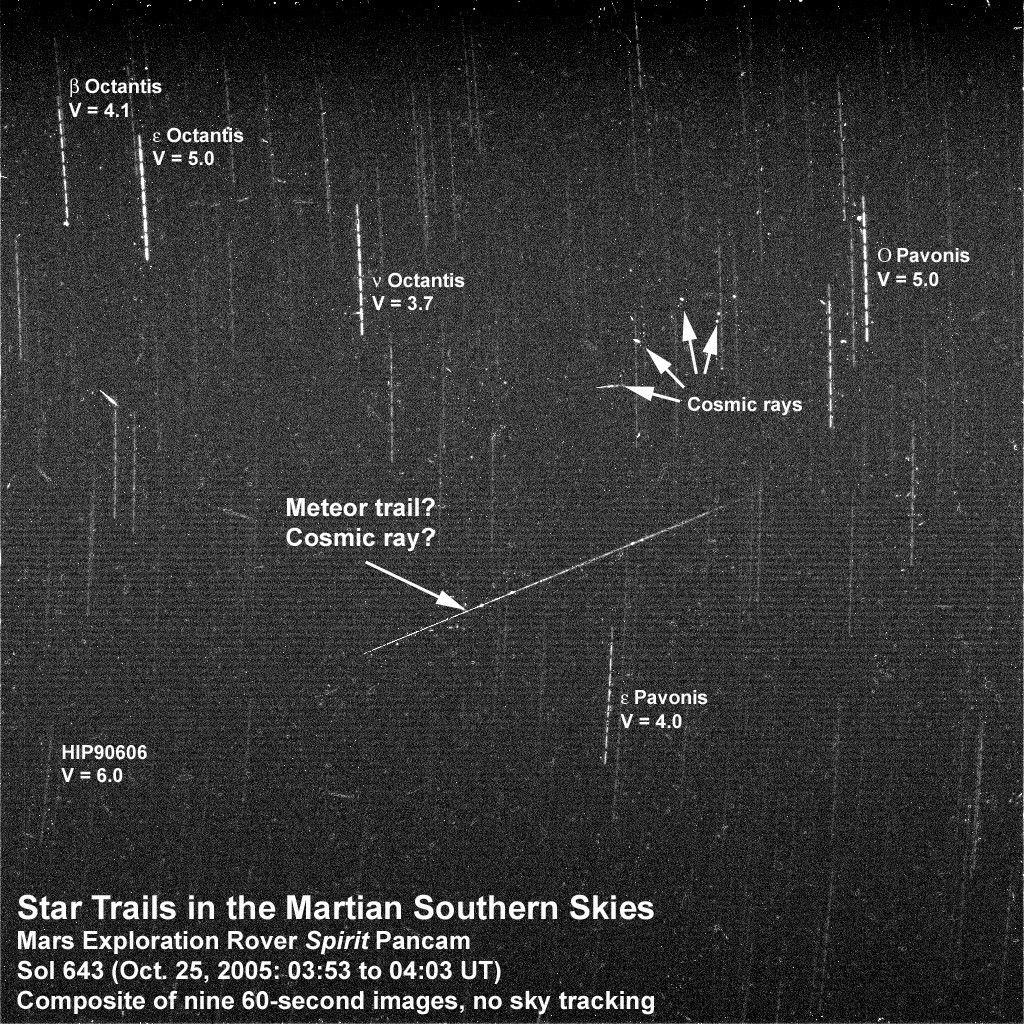 In addition to the star trails, there are several smaller linear streaks, dots and splotches that are the trails left by cosmic rays hitting the camera detectors. Cosmic rays are high-energy particles that are created in the Sun and in other stars throughout our galaxy and travel through space in all directions. Some of them strike Earth or other planets, and ones that strike a digital camera detector can leave little tracks or splotches like those seen in these images. Because they come from all directions, some strike the detector face-on, and others strike at glancing angles. Some even skip across the detector like flat rocks skipped across a pond. These are very common phenomena to astronomers used to working with sensitive digital cameras like those in the Mars rovers, the Hubble Space Telescope, or other space probes, and while they can be a nuisance when taking pictures, they generally do not cause any lasting damage to the cameras. One streak in the image, crossing at an angle very different from the direction of the stars' "motion," might be a meteor trail or could be the mark of another cosmic ray.