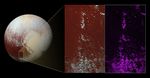 Scientists think this bright material could be predominantly methane that has condensed as an ice onto the peaks from Pluto's atmosphere. That this material coats only the upper slopes of the peaks suggests methane ice may act like water in Earth's atmosphere, condensing as frost at high altitude. Compositional data from the Ralph/Multispectral Visible Imaging Camera (MVIC) on NASA's New Horizons spacecraft, shown in the right-most inset, indicates that the location of the bright ice on the mountain peaks correlates almost exactly with the distribution of methane ice (shown in false color as purple) on the mountains.