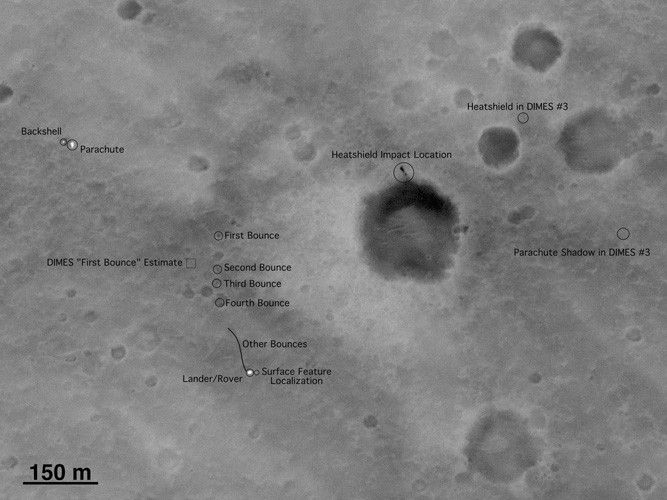 The Mars Global Surveyor (MGS) Mars Orbiter Camera (MOC), operating in martian orbit since September 1997, acquired an image of the Mars Exploration Rover (MER-A), Spirit, on 19 January 2004. The Spirit/Columbia Memorial Station is clearly seen as a bright feature in the image, as are the parachute and backshell from which Spirit was detached during the landing on 4 January 2004 (see inset for annotation). Also evident is a dark scar on the rim of a crater to the northeast of the lander; this dark marking was not present prior to landing, and is believed to have been caused by the impact of Spirit's heatshield. The lander is white because the data received from Mars were saturated at this location--that is, the lander was so much brighter than the surrounding terrain that the camera saw it as a white object.