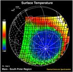 This image shows the temperature of the martian surface measured by the Mars Global Surveyor Thermal Emission Spectrometer (TES) instrument. On September 15, 3 hours and 48 minutes after the spacecrafts third close approach to the planet, the TES instrument was commanded to point at Mars and measure the temperature of the surface during a four minute scan. At this time MGS was approximately 15,000 miles (~24,000 km) from the planet, with a view looking up from beneath the planet at the south polar region. The circular blue region (- 198 F) is the south polar cap of Mars that is composed of CO2 ice. The night side of the planet, shown with crosses, is generally cool (green). The sunlit side of the planet reaches temperatures near 15 F (yellow). Each square represents an individual observation acquired in 2 seconds with a ground resolution of ~125 miles (~200 km). The TES instrument will remain on and collect similar images every 100 minutes to monitor the temperature of the surface and atmosphere throughout the aerobraking phase of the MGS mission.