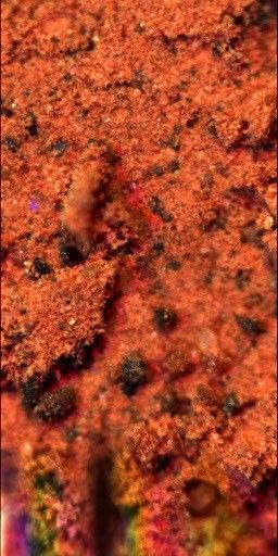 The soil is mostly composed of fine orange particles, and also contains larger grains, about a tenth of a millimeter in diameter, and of various colors. The soil is sticky, keeping together as a slab of material on the supporting substrate even though the substrate is tilted to the vertical.