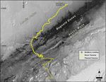 The base image for the map is from the High Resolution Imaging Science Experiment (HiRISE) camera on the Mars Reconnaissance Orbiter. North is up. "Bagnold Dunes" form a band of dark, wind-blown material at the foot of Mount Sharp.