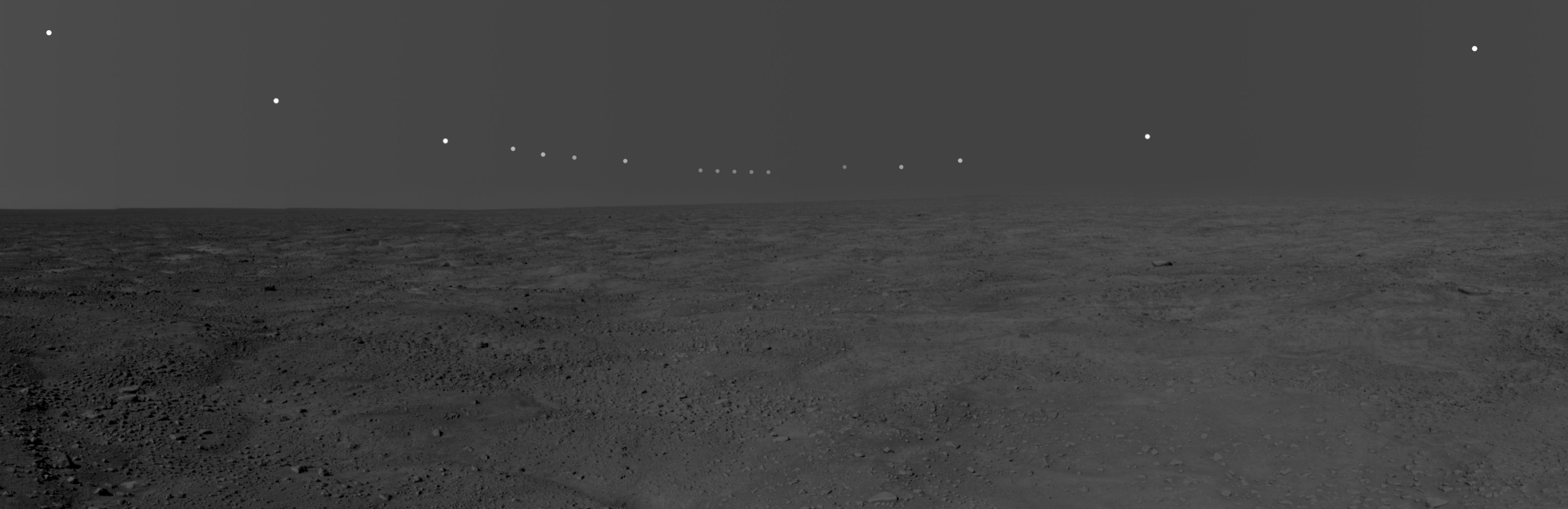 The foreground and sky images were taken on Sol 54, or the 54th Martian day of the mission (July 20, 2008). The solar images were taken between 10 p.m. and 2 a.m., local solar time, during the nights of sols 46 to 56. During this period of 11 sols, the sun's path got slightly lower over the northern horizon, causing the lack of smoothness to the curve. This pan captures the polar nature of the Phoenix mission in its similarity to time lapse pictures taken above the Arctic Circle on Earth.