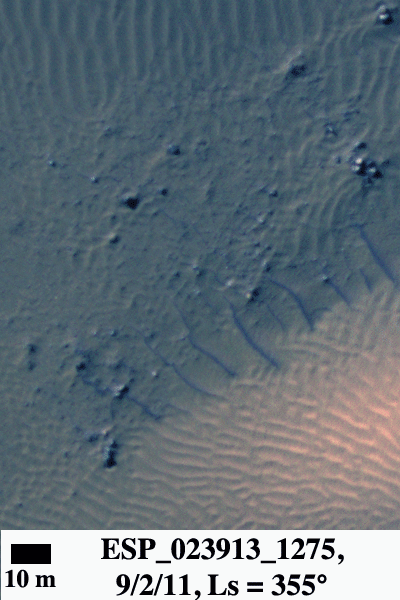 In these two images, there is little distortion (a digital elevation model would remove more distortion). Here, we focus on the southern and northern part of two adjacent dunes. With an animated image, the displacement of ripples on the dunes relative to nearby rocks and dark ripples are clearly visible. It seems that the ripples on the southern dune are moving northeast, while those on the northern dune are moving west, indicating complex winds in this area. The static dark ripples may be composed of larger grains than those in the dunes and are therefore harder to move.