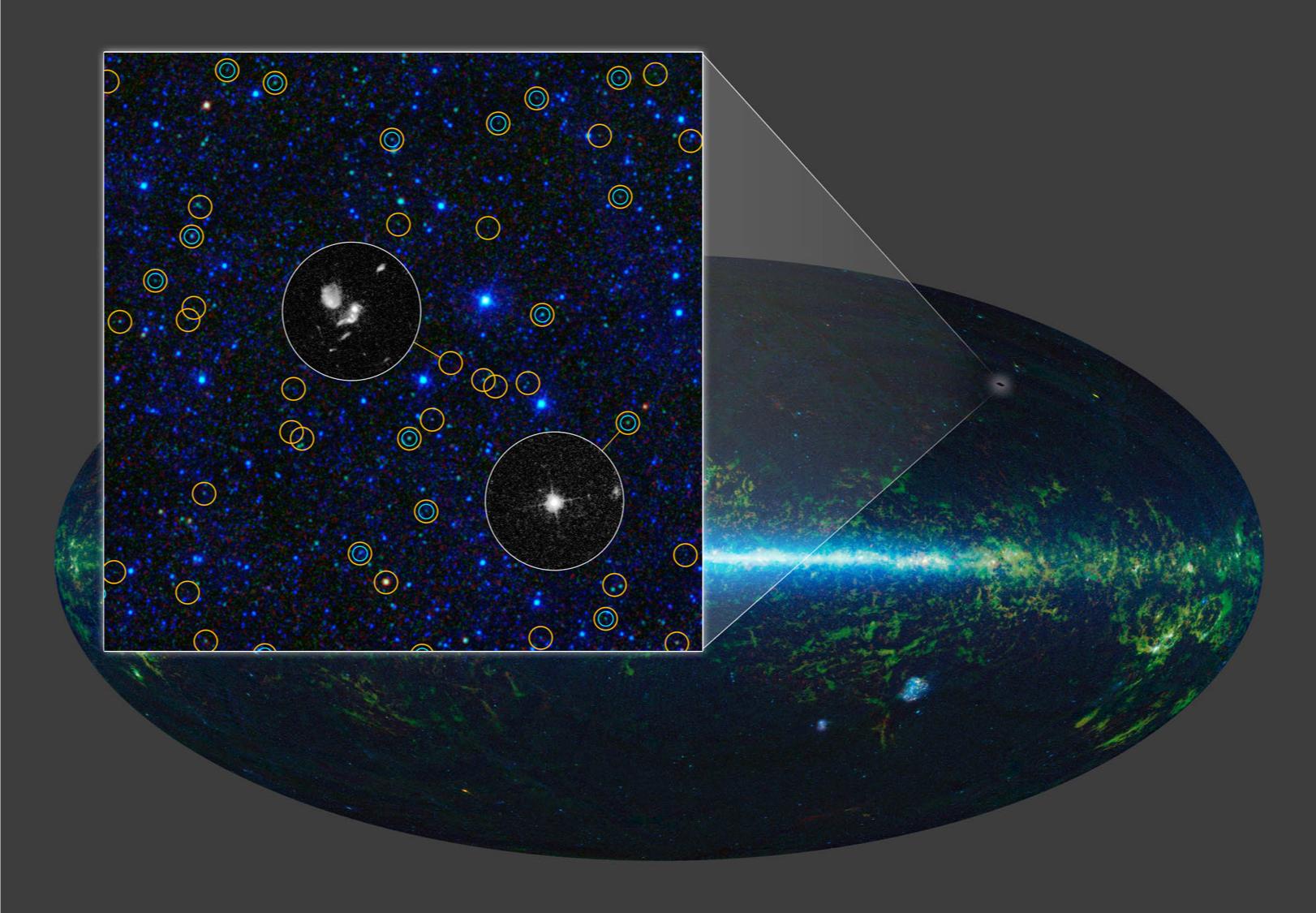 Peering more than 10 billion light-years into the distance, WISE has found tens of millions of actively feeding supermassive lack holes across the full sky. The orange circles highlight those that the telescope identified in a small patch of sky; the two zoomed-in images came from the Hubble Space Telescope. WISE easily sees these monsters because their powerful, accreting black holes warm the dust, causing it to glow in infrared light. The blue circles indicate black holes that were detected using visible-light imagers. In most, that light is blocked by dust.
