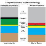Two key differences in the Murray Buttes mudstone include hematite rather than magnetite, and far less abundance of crystalline mafic minerals, compared to the Yellowknife Bay mudstone composition. Hematite and magnetite are both iron oxide minerals, with hematite as a more oxidized one. That difference could result from the Murray Buttes mudstone layer experiencing more weathering than the Yellowknife Bay mudstone. More weathering could also account for the lower abundance of crystalline mafics, which are volcanic-origin minerals such as pyroxene and olivine.